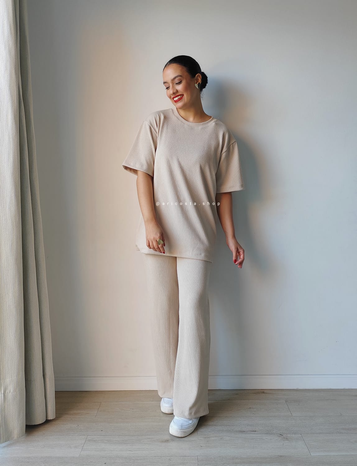 Conjunto em blusa oversized alongada, calça com bolsos frontais e elástico na cintura cós alto. Confeccionado em malha jacquard canelada.