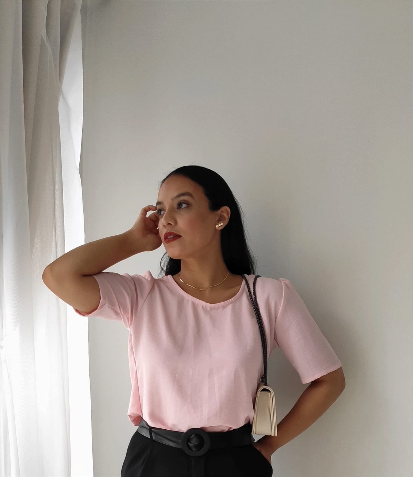 Descrição: confeccionado em Crepe, gola O, mangas levemente bufantes.