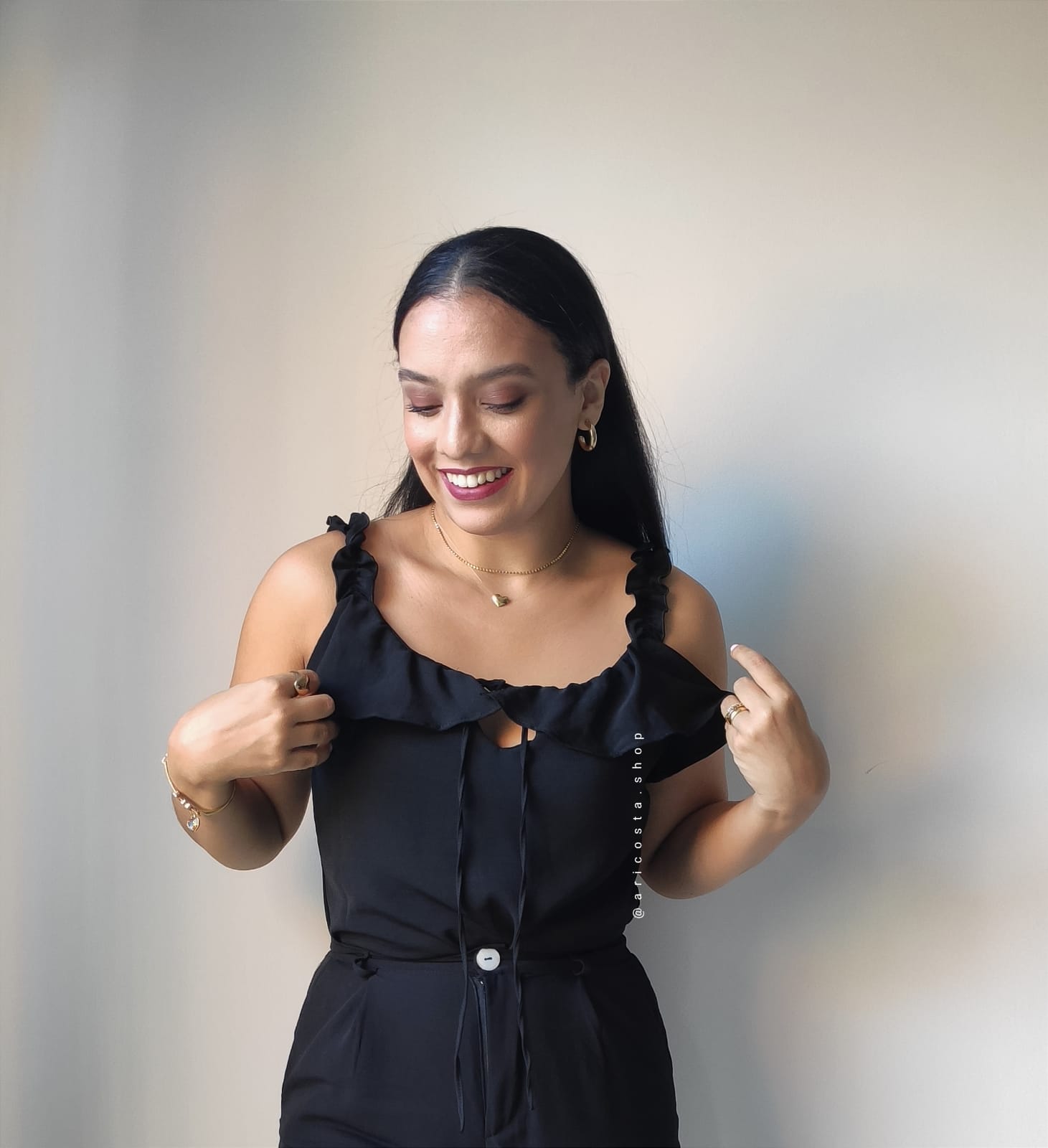 Tecido crepe, alças com elastico, decote quadrado e ajustavel, babados em todo decote