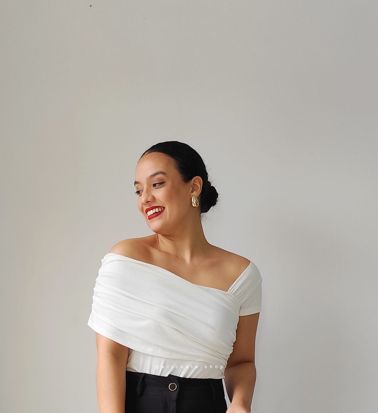 Descrição : Blusa confeccionada em malha com elastano, decote assimétrico.