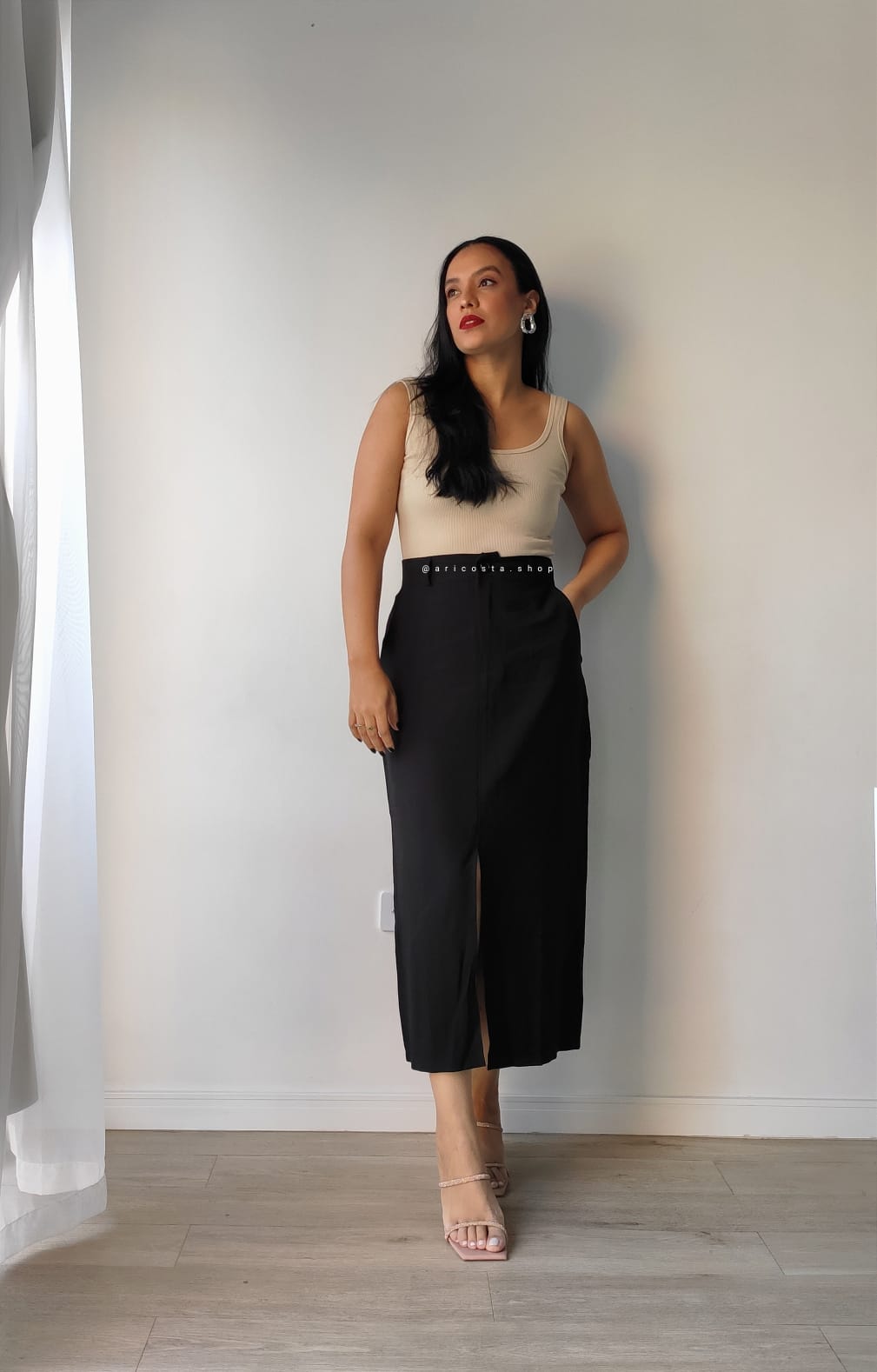 Saia Semi Midi com fenda frontal, no tecido Marrant ( uma mistura de viscose, algodão e poliester) não tem elastano, cintura alta, fecho e botão para fechamento, possui elástico na parte de trás da cintura e passador de cinto.