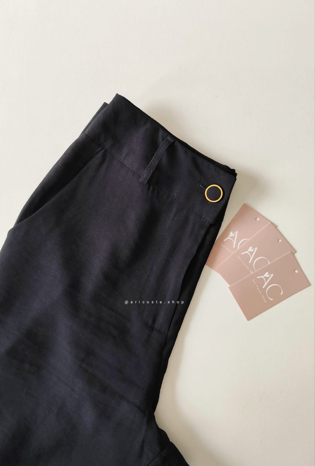 Calça modelagem pantalona com bolsos frontais, atrás não possui bolso, passante para cinto, botão encapado e ziper para fechamento, cós alto, no tecido marcante um tipo de viscose com caimento alfaiataria.