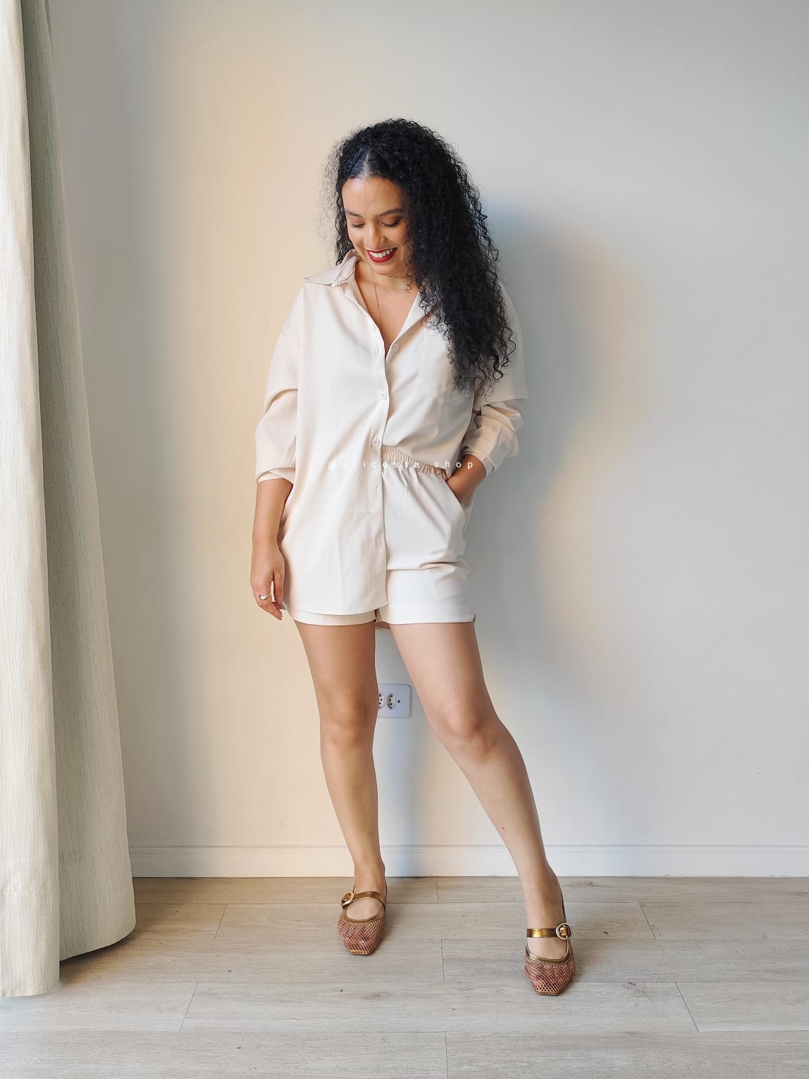 Conjunto em camisa oversized alongada, short modelo boxer com bolsos frontais e elástico na cintura cós alto. Confeccionado no tecido marrant